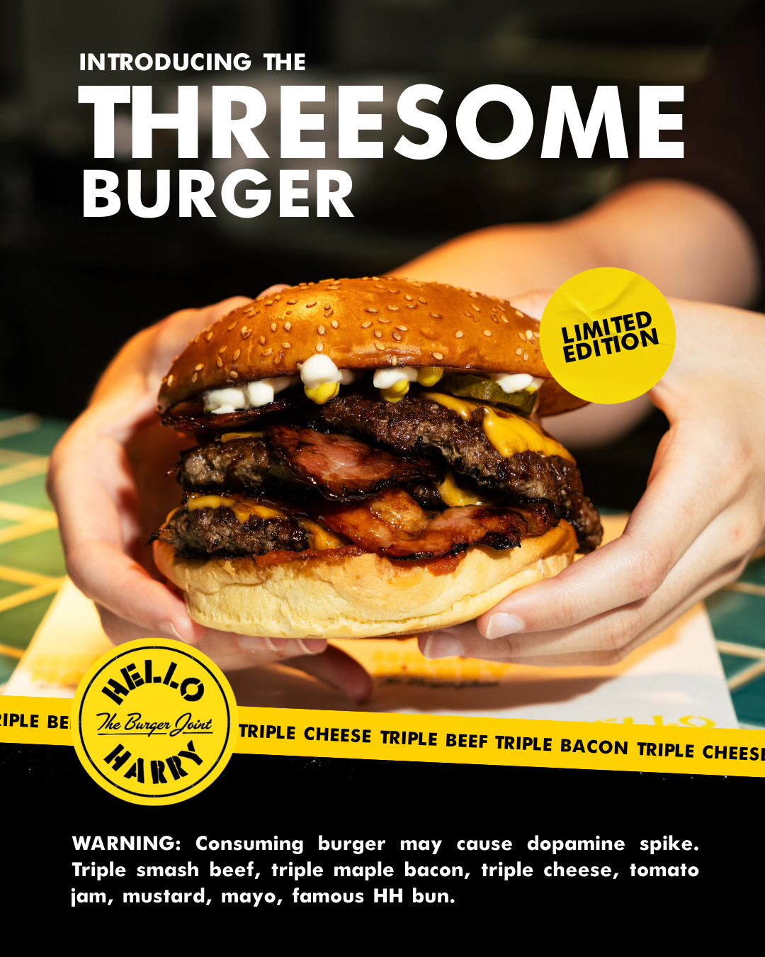 Limited Edition - Triple smashed beef, triple cheese, triple maple bacon, pickles, tomato jam, mayo and mustard on a medium bun - only $15 (upsize to a large for only $10)
